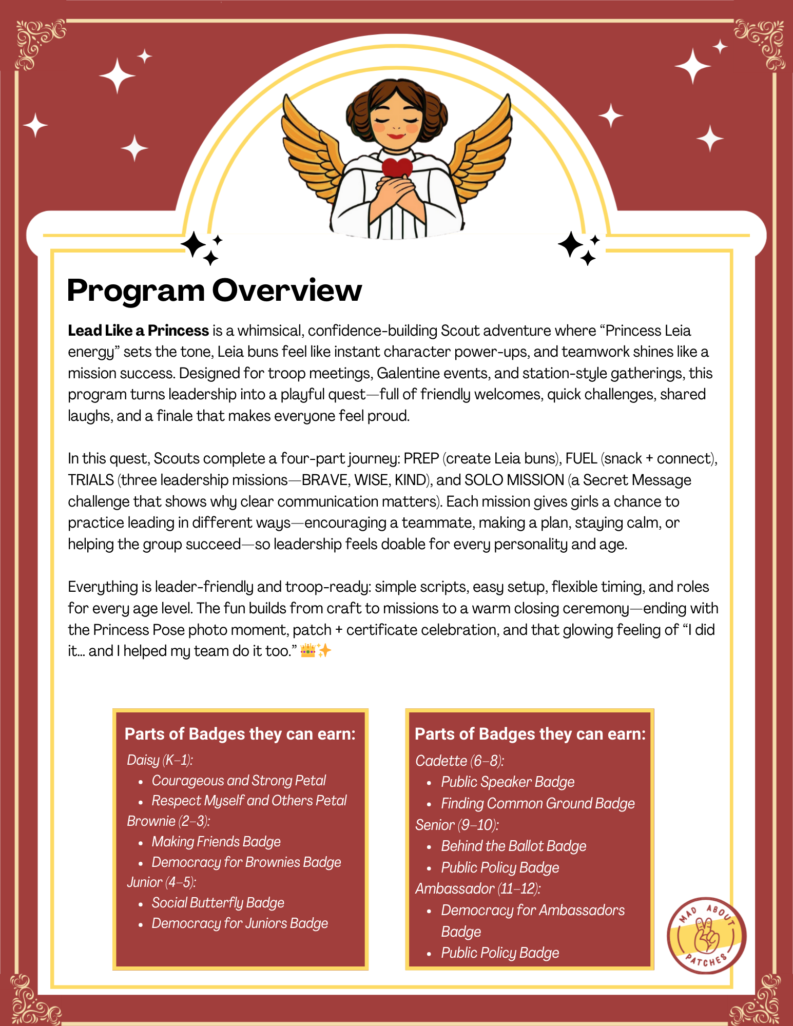 In this four-part leadership adventure, Scouts become Princess Leaders and complete: PREP (Leia buns), FUEL (snack + connect), TRIALS (BRAVE • WISE • KIND missions), and SOLO MISSION (Secret Message communication quest). Leaders guide the flow with simple scripts, clear station goals, and game-style challenges that feel like pure fun—while secretly building teamwork, confidence, and leadership habits.