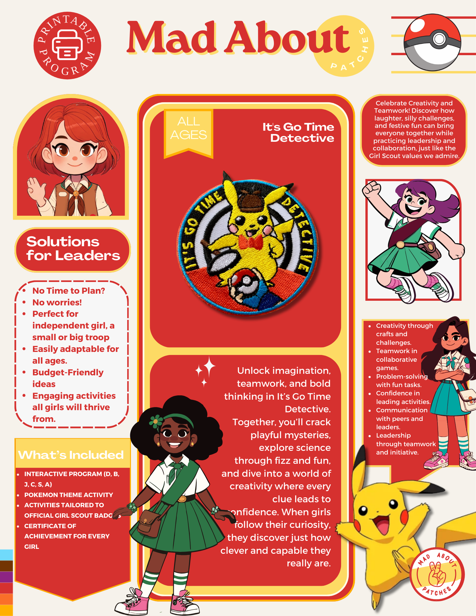 It’s Go Time Detective is a fully printable, leader-led patch program where kids become junior sleuths in a playful adventure-and-discovery theme. With scavenger hunts, mystery challenges, “capture-sphere” crafts, and bubbling STEM experiments, each activity builds confidence, leadership, and creative thinking.