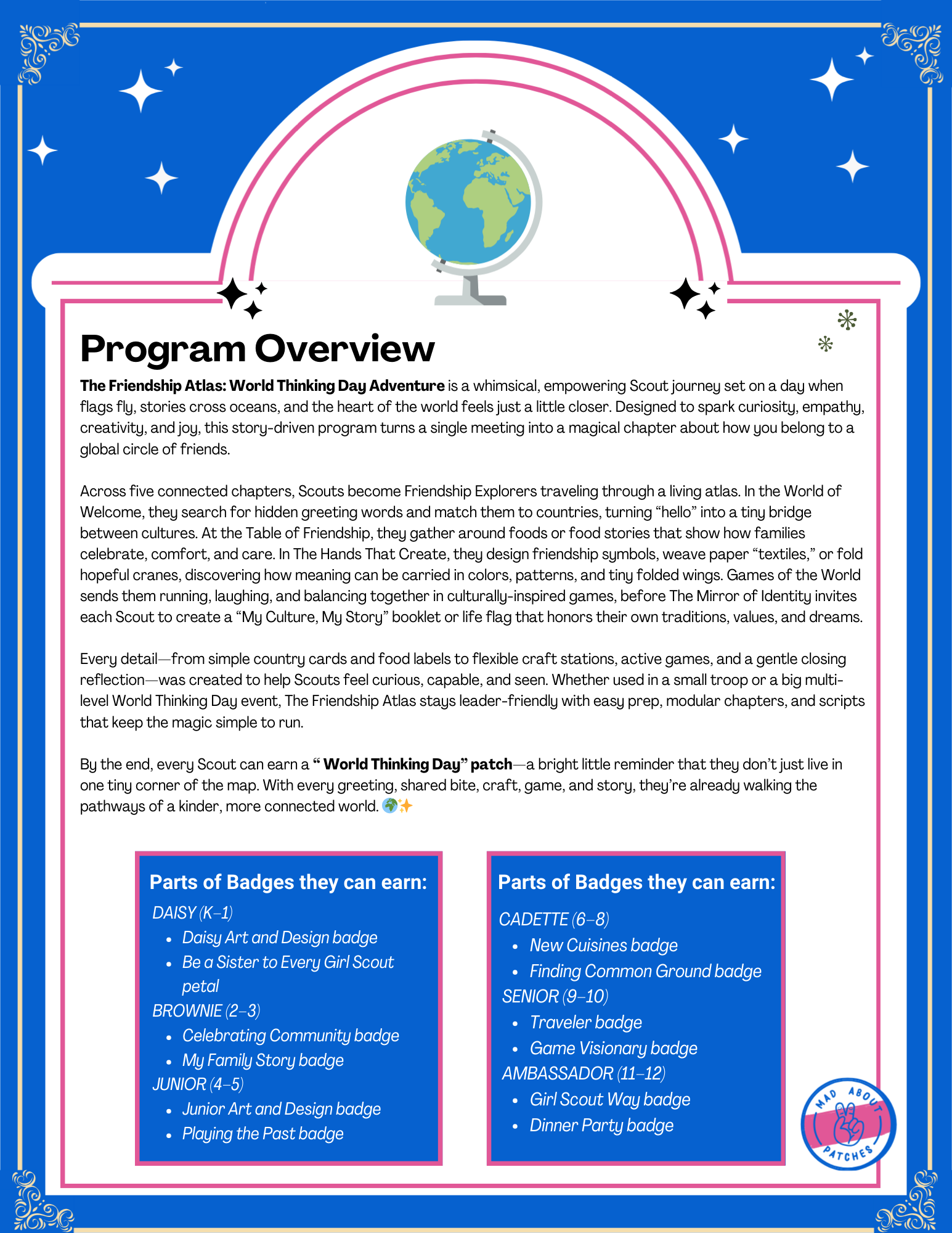 Whether you run the program in a troop meeting, service unit event, camp day, or a council-wide 100th World Thinking Day celebration, The Friendship Atlas blends story, activity, and reflection into an experience that helps every Scout feel curious, connected, and proud to be part of a global movement that has been growing strong for a century.