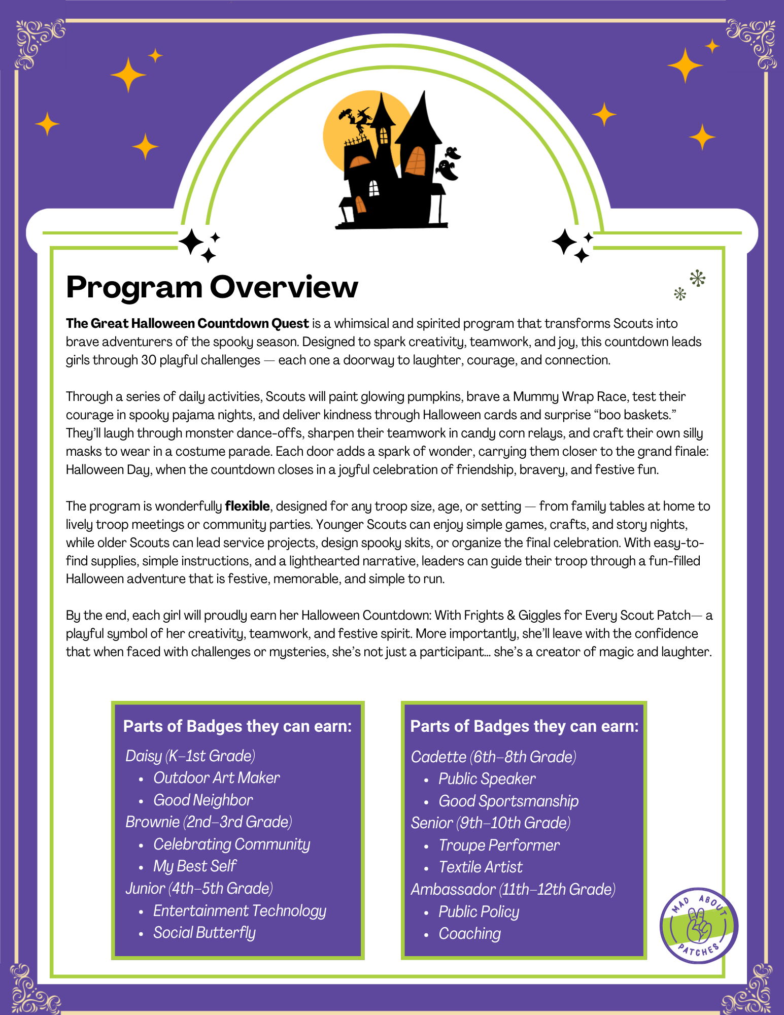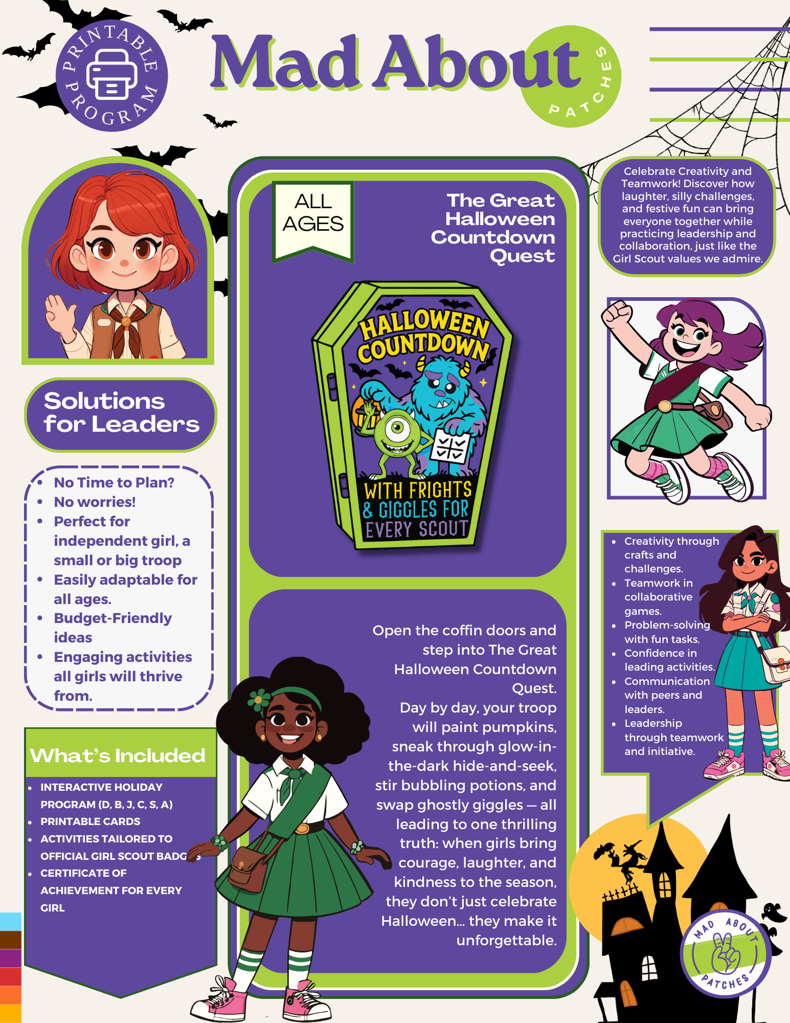 Whether run at a meeting, at home with families, or as a larger community event, The Great Halloween Countdown Quest is flexible, story-driven, and simple to run—helping every girl feel creative, confident, and connected.