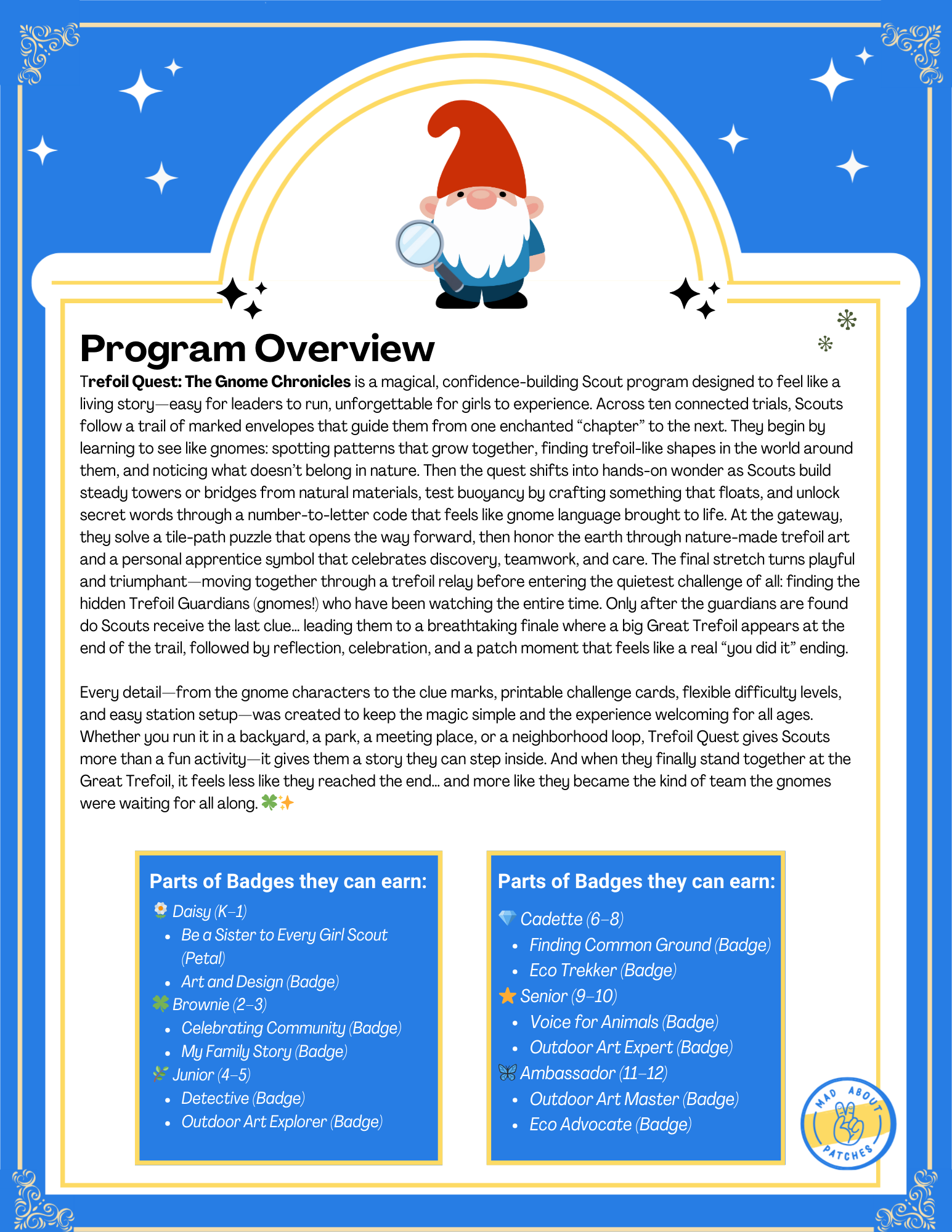 Leaders, are you ready to turn your meeting place into a storybook trail where envelopes wear secret marks, tiny guardians hide in plain sight, and the Great Trefoil waits at the end like a treasure meant only for the kindest teams? Trefoil Quest: The Gnome Chronicles is an out-of-this-world Scout adventure that blends scavenger-hunt excitement, STEM challenges, puzzles, nature crafting, active games, and a cinematic finale into one magical program. As Scouts become Gnome Apprentices, theyāll follow a trail of clue envelopes, complete 10 whimsical trials, discover the hidden Trefoil Guardians (gnomes!), and unlock the final reveal: a BIG Trefoil moment that feels like the last page of a fairytale.